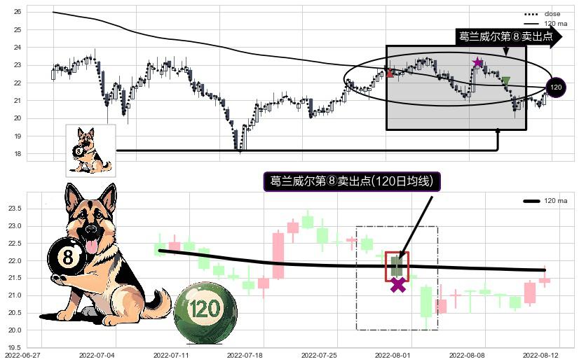形态多维评估: ⚀ 2022-07-29-日显现 葛兰威尔均线 120日均线 第⑧卖出点 下降趋势的中继信号,后市看跌,卖出信号