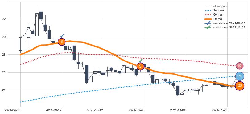 下跌趋势2021-09-03-2021-11-25,均线20确认关键阻力2处