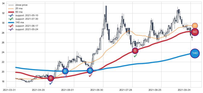 上涨趋势2021-03-31-2021-09-27,均线140, 60确认关键支撑4处