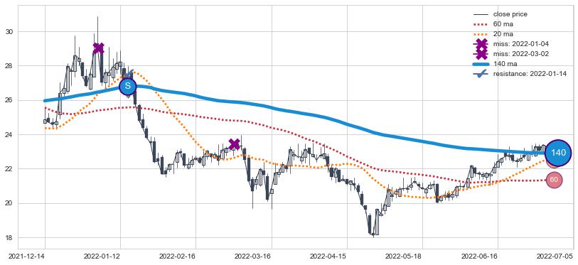 下跌趋势2021-12-14-2022-07-05,均线140确认关键阻力1处