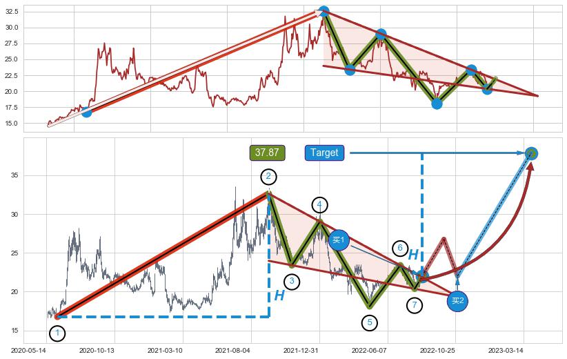 ➣ 【仅预测突破】最后价格:21.48与预测突破价格:22.00→【空间临近】后续最小【整理】第一目标价格→(2023-03-29: 37.87 )