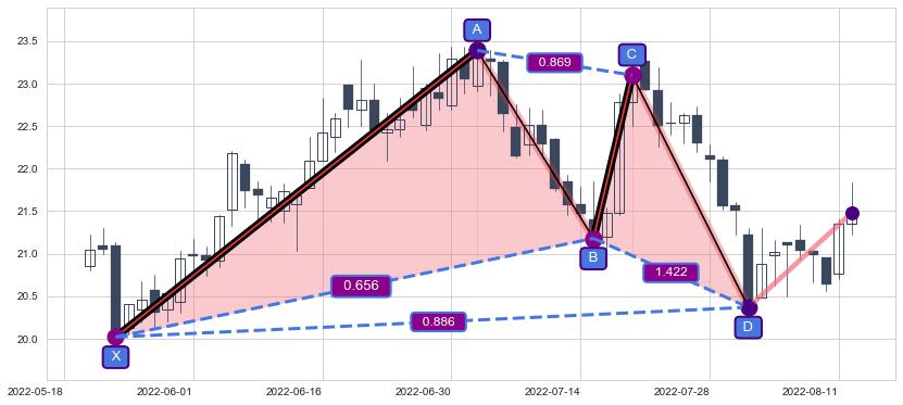➣ 未完成【蝙蝠】形态起点X: 2022-01-04, 已到达C点: 2022-08-02, 预测最终D点: 2023-01-10, 共255交易日