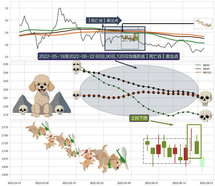 ➣ 上探下跌 + 【死亡谷】卖出点死亡谷均线交叉卖出点信号叠加后【目标达成率】极低,【看空】信号叠加【存续影响极大】