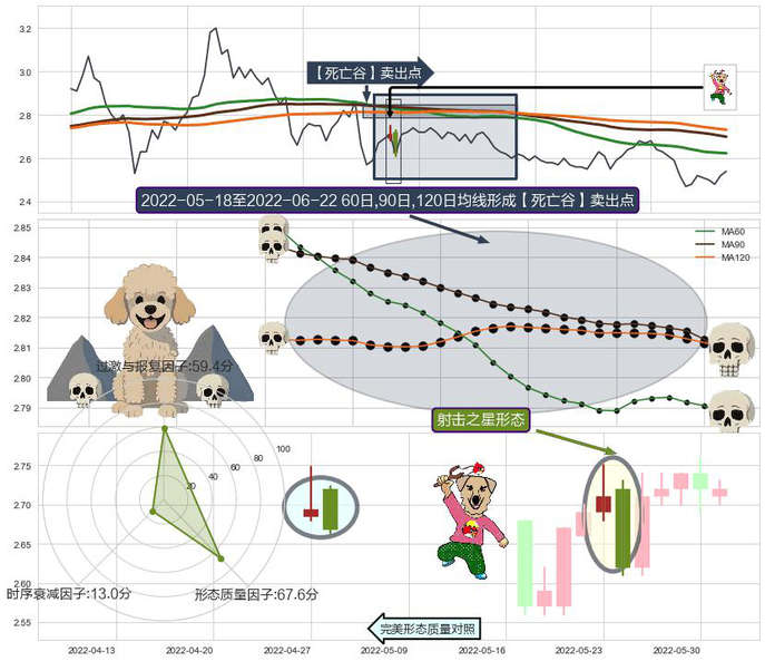 ➣ 射击之星形态 + 【死亡谷】卖出点死亡谷均线交叉卖出点信号叠加后【目标达成率】低,【看空】信号叠加【存续影响大】