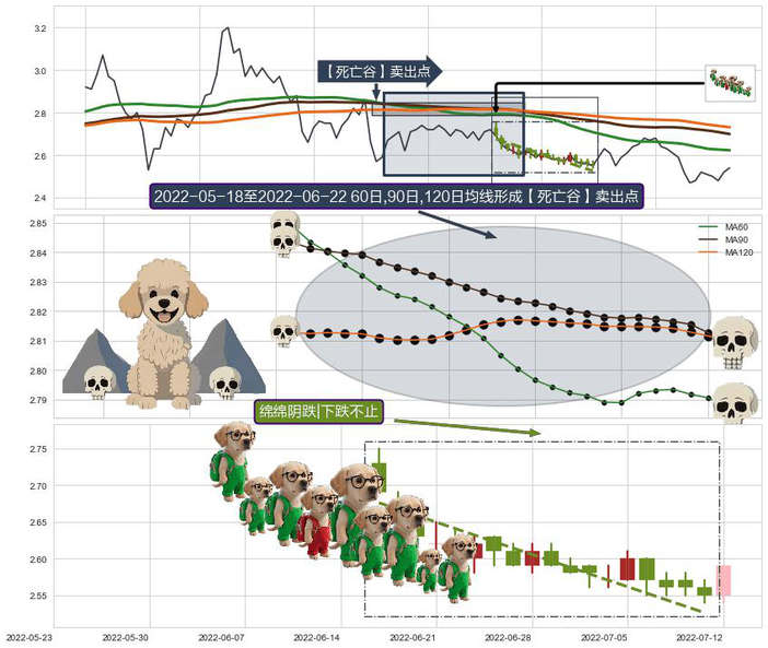 ➣ 绵绵阴跌|下跌不止 + 【死亡谷】卖出点死亡谷均线交叉卖出点信号叠加后【信号初始稳固度】高,【看空】信号叠加【可信度影响大】
