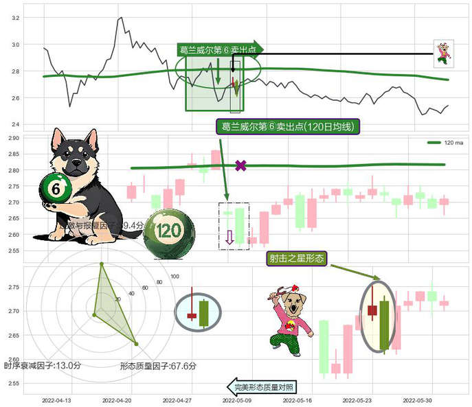 ➣ 射击之星形态 + 葛兰威尔第⑥卖出点葛兰威⑥卖:趋势逆转拐点信号叠加后【目标达成率】低,【看空】信号叠加【存续影响大】