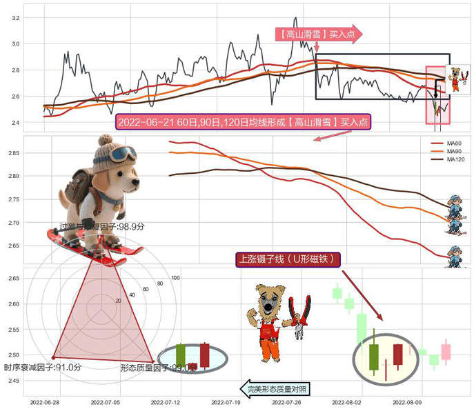 ➣ 上涨镊子线(U形磁铁) + 【高山滑雪】买入点高山滑雪见底拐点买入点信号叠加后【信号初始稳固度】极低,【看多】信号叠加【可信度影响极小】