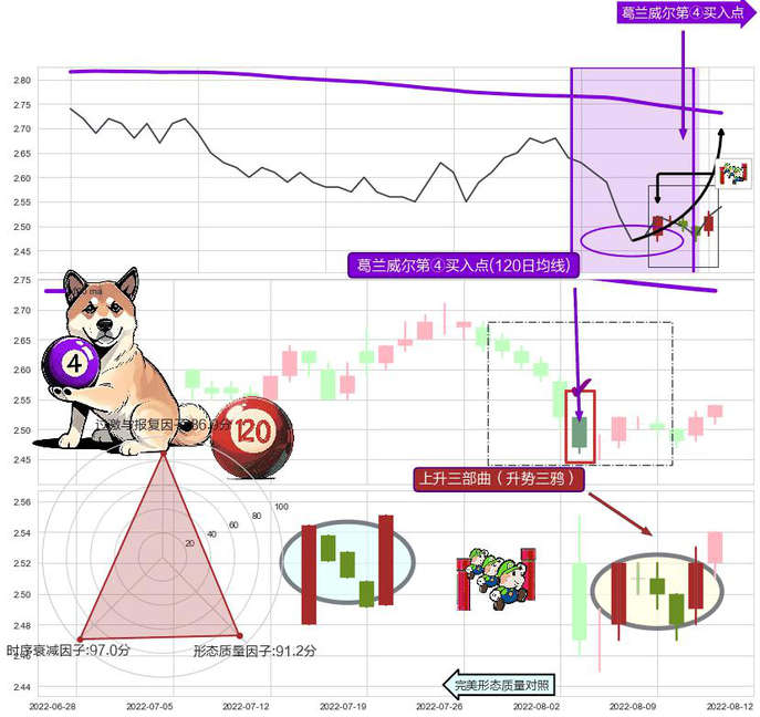 ➣ 上升三部曲(升势三鸦) + 葛兰威尔第④买入点葛兰威④买:期望均线引力作用信号叠加后【信号初始稳固度】低,【看多】信号叠加【可信度影响小】