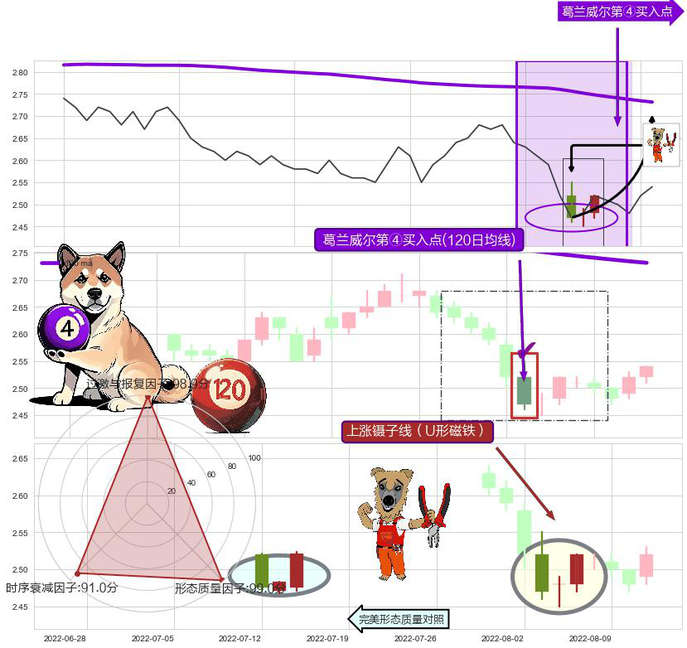➣ 上涨镊子线(U形磁铁) + 葛兰威尔第④买入点葛兰威④买:期望均线引力作用信号叠加后【信号初始稳固度】极低,【看多】信号叠加【可信度影响极小】