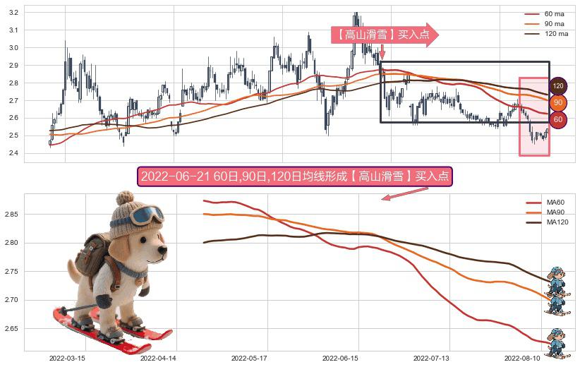 形态多维评估: ⚀ 2022-04-22日-2022-08-12日显现 60日-90日-120日均线 【高山滑雪】买入点 看多信号,后市看涨,买入
