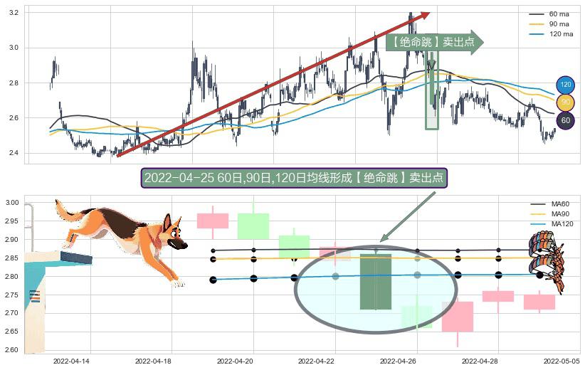 形态多维评估: ⚀ 2022-04-25日显现 60日-90日-120日均线 【绝命跳】卖出点 看空信号,后市看跌,卖出