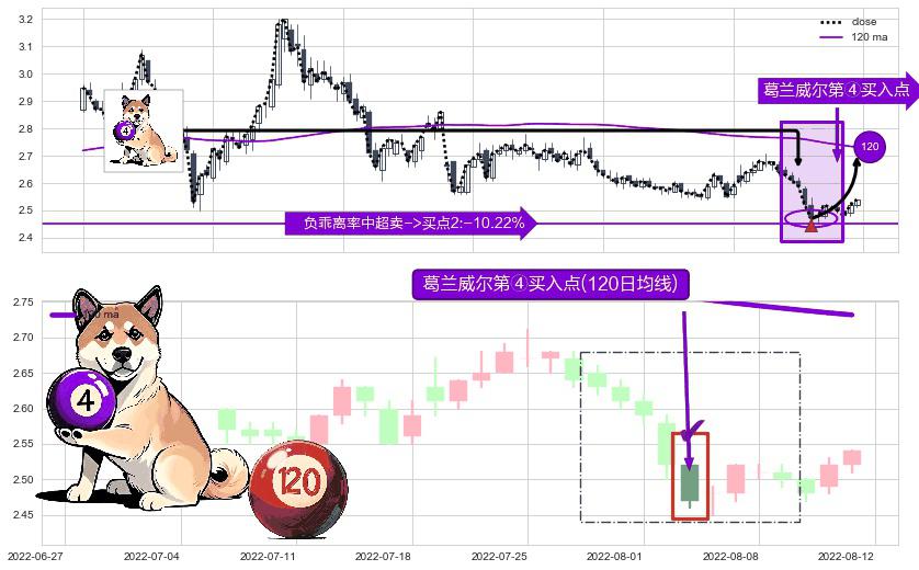 形态多维评估: ⚀ 2022-08-03-日显现 葛兰威尔均线 120日均线 第④买入点 下降趋势均值回复的短线反弹信号,后市看涨,买进信号
