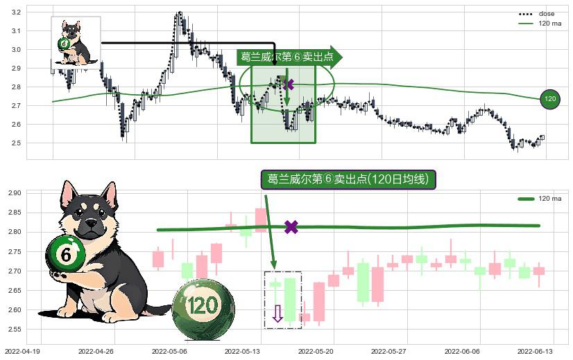 形态多维评估: ⚀ 2022-05-16-日显现 葛兰威尔均线 120日均线 第⑥卖出点 走势反转见顶信号,后市看跌,卖出信号
