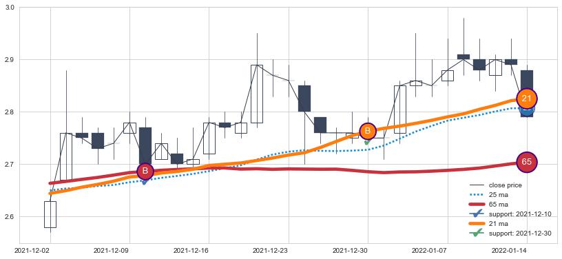 上涨趋势2021-12-02-2022-01-14,均线65, 21确认关键支撑2处