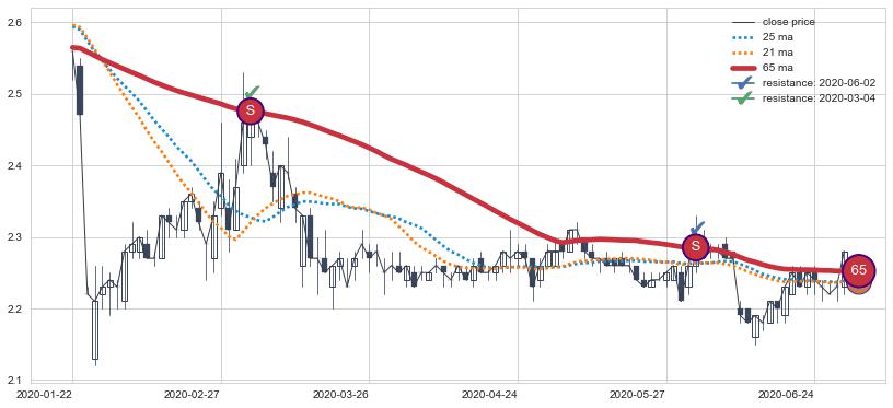 下跌趋势2020-01-22-2020-07-02,均线65确认关键阻力2处