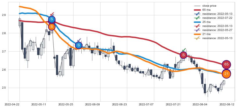 下跌趋势2022-04-22-2022-08-12,均线65, 21, 25确认关键阻力3处