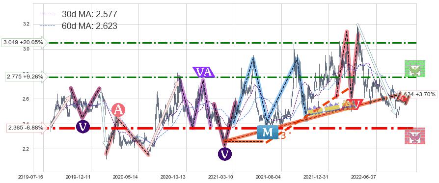 ♘ 阻力价格位2.775,可信任强度60.73%,距离最后交易2022-08-12形成的收盘价格2.540相差 +9.26%