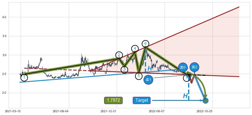 ➢ 最小反转跌幅→𝐇: 0.6770 (逐步抬高阻力斜边最后的阻力点⑥与支撑边垂直距离)