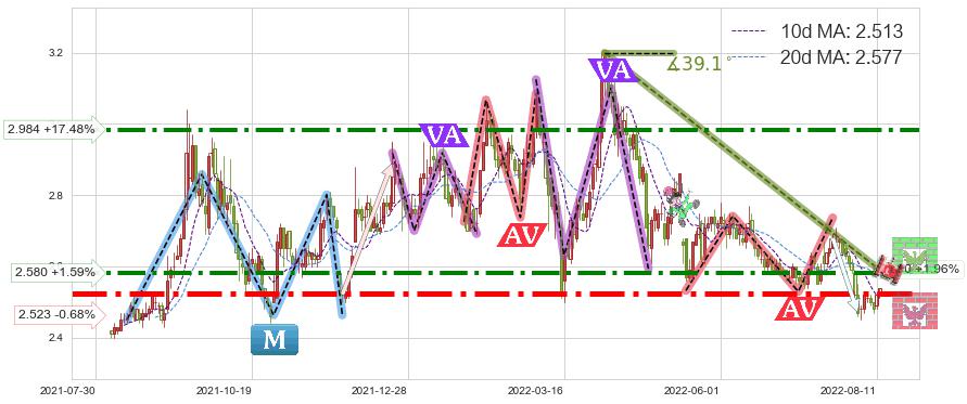 ♘ 阻力价格位2.580,可信任强度74.22%,距离最后交易2022-08-12形成的收盘价格2.540相差 +1.59%