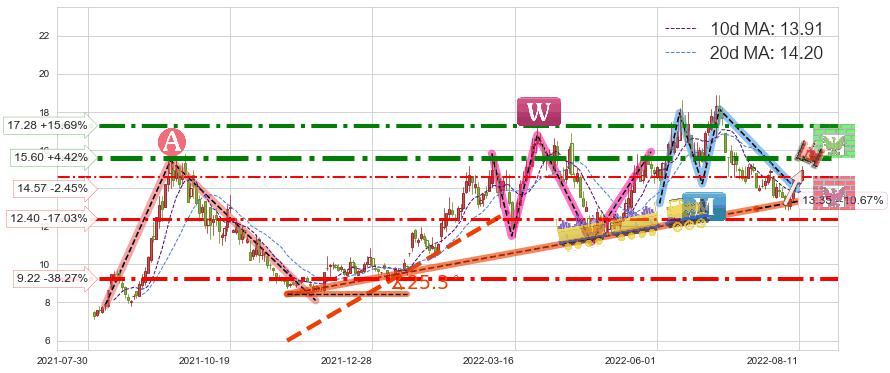♘ 阻力价格位15.60,可信任强度86.83%,距离最后交易2022-08-12形成的收盘价格14.94相差 +4.42%