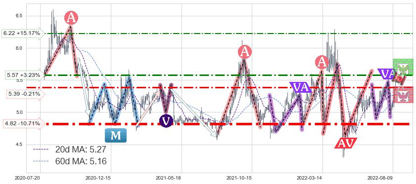 ♘ 阻力价格位6.22,可信任强度52.35%,距离最后交易2022-08-12形成的收盘价格5.40相差 +15.17%