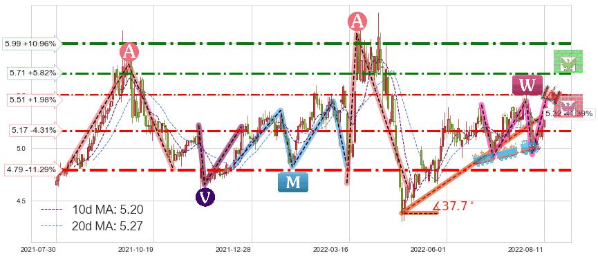 ♘ 阻力价格位5.99,可信任强度77.54%,距离最后交易2022-08-12形成的收盘价格5.40相差 +10.96%