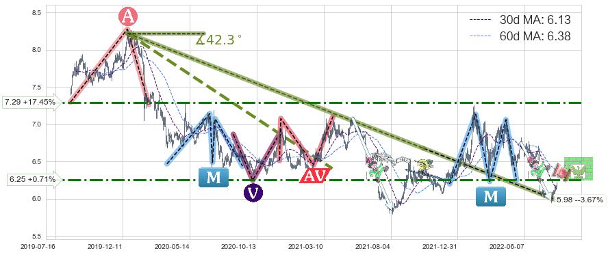 ♞ 30日均线:6.13,60日均线:6.38→ 快线<慢线
