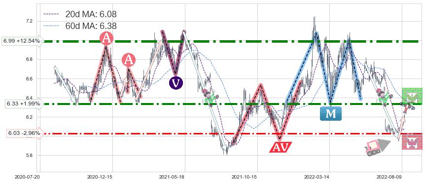 ♘ 阻力价格位6.99,可信任强度96.64%,距离最后交易2022-08-12形成的收盘价格6.21相差 +12.54%