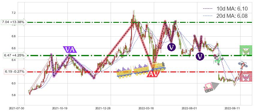 ♘ 阻力价格位6.47,可信任强度82.77%,距离最后交易2022-08-12形成的收盘价格6.21相差 +4.25%