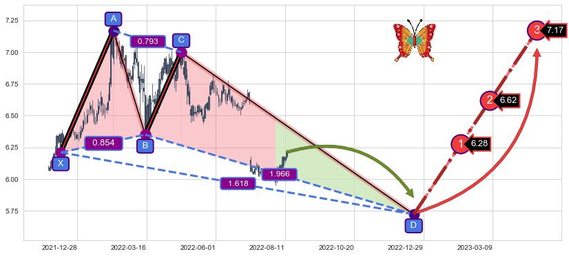 ➣ 未完成【蝴蝶】形态起点X: 2021-12-10, 已到达C点: 2022-04-22, 预测最终D点: 2022-12-20, 共248交易日
