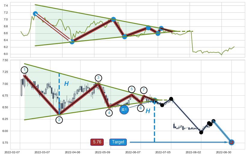 ➣ D点拟合预测价格5.72,距离最后交易收盘价格6.21相差 -7.86%