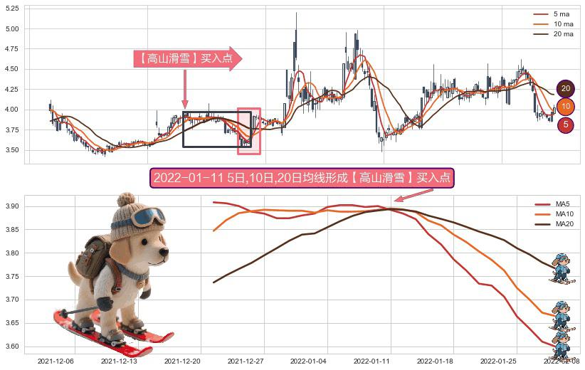 ⚀ 2021-12-21日-2022-01-28日显现 5日-10日-20日均线 【高山滑雪】买入点 看多信号,后市看涨,买入
