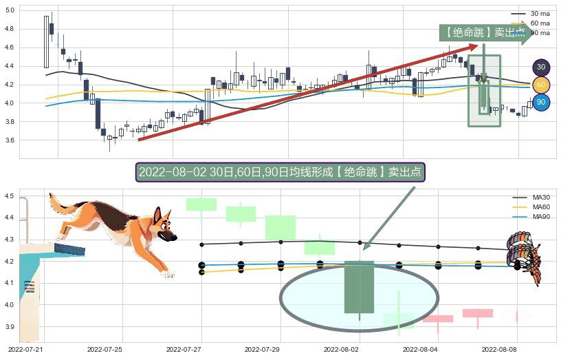 ⚀ 2022-08-02日显现 30日-60日-90日均线 【绝命跳】卖出点 看空信号,后市看跌,卖出