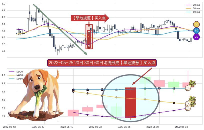 ⚀ 2022-05-25日显现 20日-30日-60日均线 【旱地拔葱】买入点 看多信号,后市看涨,买入