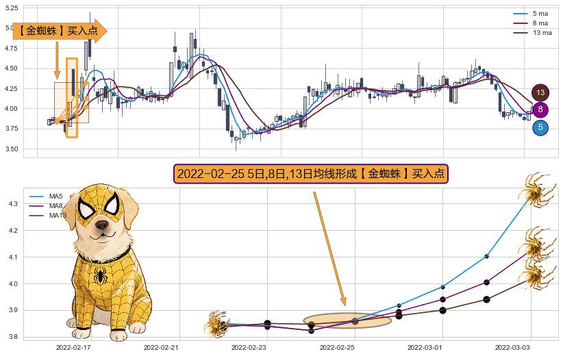 ⚀ 2022-02-25日显现 5日-8日-13日均线 【金蜘蛛】买入点 看多信号,后市看涨,买入