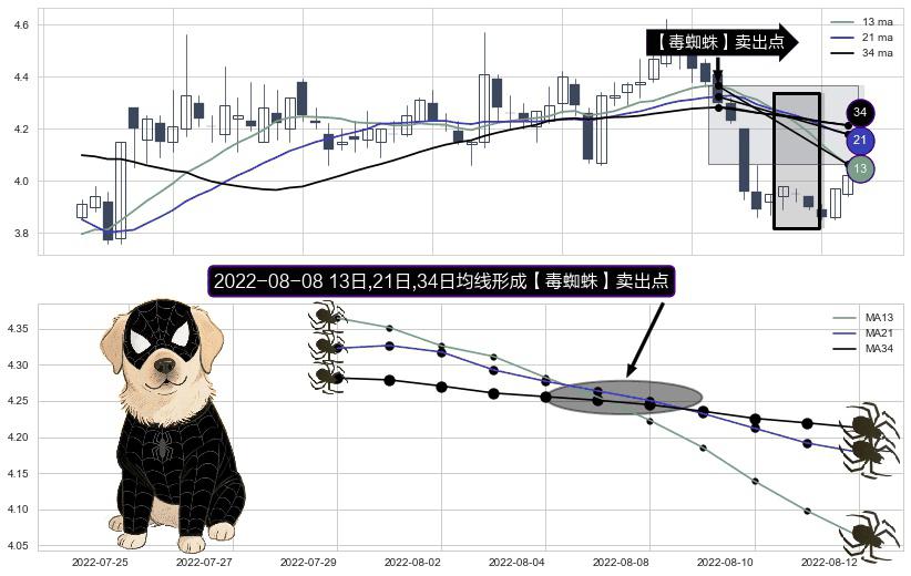 ⚀ 2022-08-08日显现 13日-21日-34日均线 【毒蜘蛛】卖出点 看空信号,后市看跌,卖出