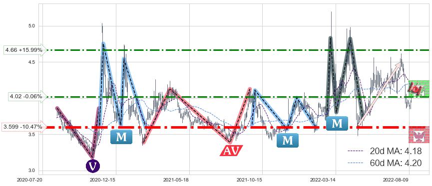 ♘ 阻力价格位4.02,可信任强度65.35%,距离最后交易2022-08-12形成的收盘价格4.02相差 -0.06%