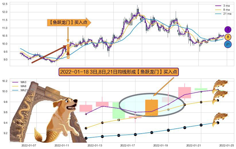 ⚀ 2022-01-18日显现 3日-8日-21日均线 【鱼跃龙门】买入点 看多信号,后市看涨,买入