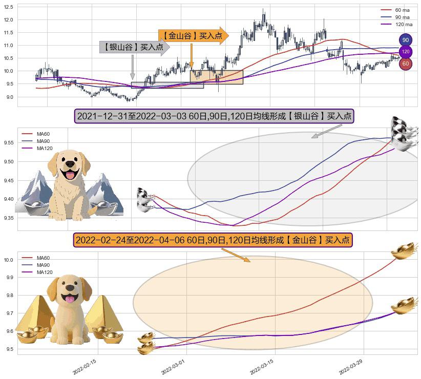 ⚃ 2022-02-25-日至2022-04-06-日显现 60日-90日-120日均线 【金山谷】买入点 其再次确认了买入信号,可靠性更强,买入