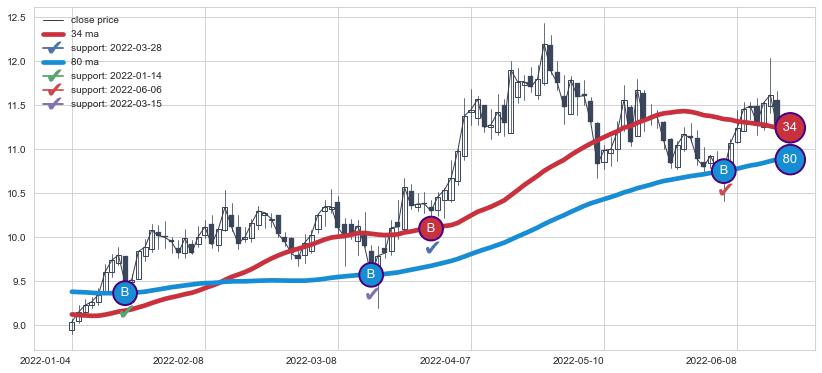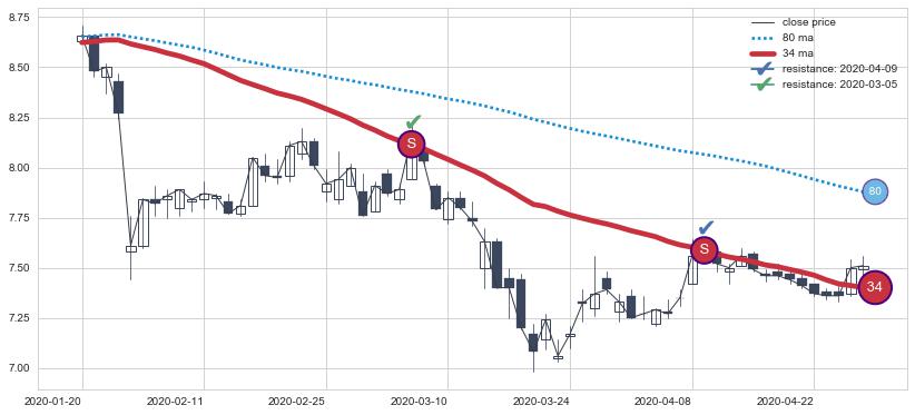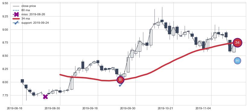 ⚅ 卖点向下突破均线后,价格走势有持续向下的迹象,但动能稍显不足,迟迟不能远离均线