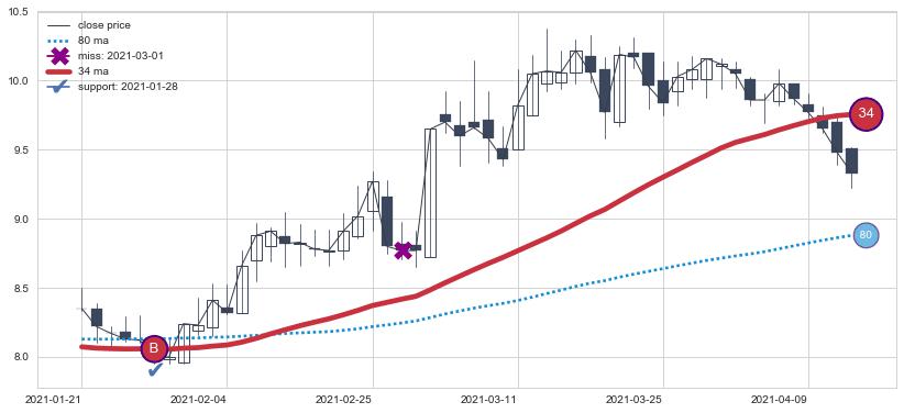 ⚁ MA3和MA8走势平行,且始终保持在短距离内,MA21始终在短中期均线上方,与短中期均线保持一定的距离,微微下行