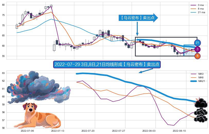 ⚀ 2022-07-15日-2022-08-12日显现 3日-8日-21日均线 【乌云密布】卖出点 看空信号,后市看跌,卖出