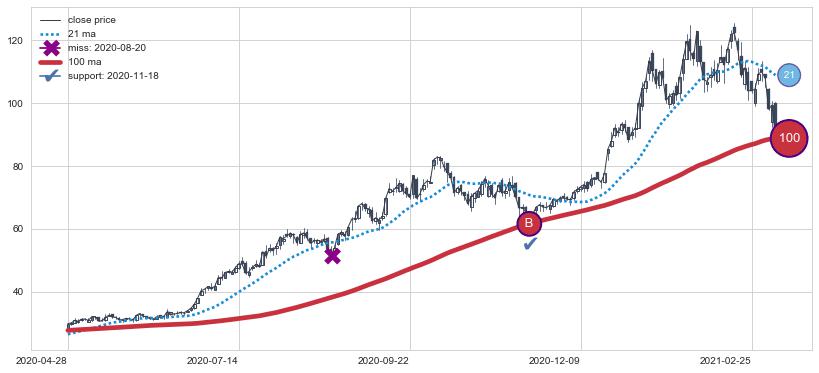 ⚁ MA3和MA8走势平行,且始终保持在短距离内,MA21始终在短中期均线上方,与短中期均线保持一定的距离,微微下行
