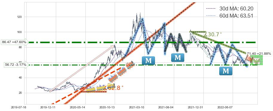 ♘ 阻力价格位86.47,可信任强度88.55%,距离最后交易2022-08-12形成的收盘价格58.58相差 +47.60%