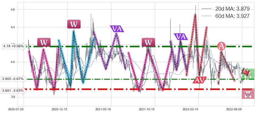 ♘ 阻力价格位3.805,可信任强度64.80%,距离最后交易2022-08-12形成的收盘价格3.830相差 -0.67%