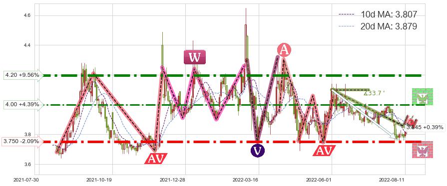 ➣ 【已确认突破】最后价格:3.830与最小【整理】第一目标价格→(2022-08-31: 3.540 )相较: 下跌空间【较大】