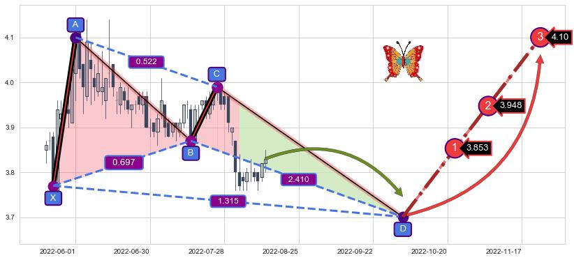 ➣ 未完成【蝴蝶】形态起点X: 2022-05-24, 已到达C点: 2022-07-26, 预测最终D点: 2022-10-04, 共88交易日