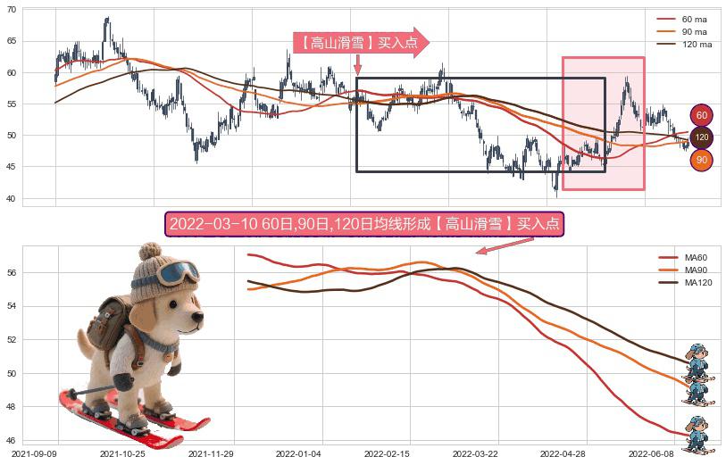 ⚀ 2021-12-03日-2022-06-14日显现 60日-90日-120日均线 【高山滑雪】买入点 看多信号,后市看涨,买入
