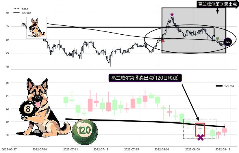 ⚀ 2022-08-08-日显现 葛兰威尔均线 120日均线 第⑧卖出点 下降趋势的中继信号,后市看跌,卖出信号