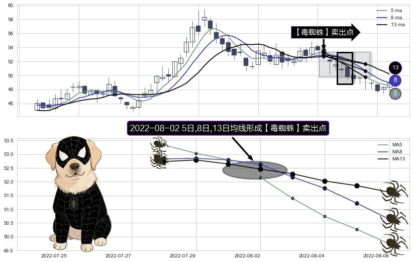 ⚀ 2022-08-02日显现 5日-8日-13日均线 【毒蜘蛛】卖出点 看空信号,后市看跌,卖出